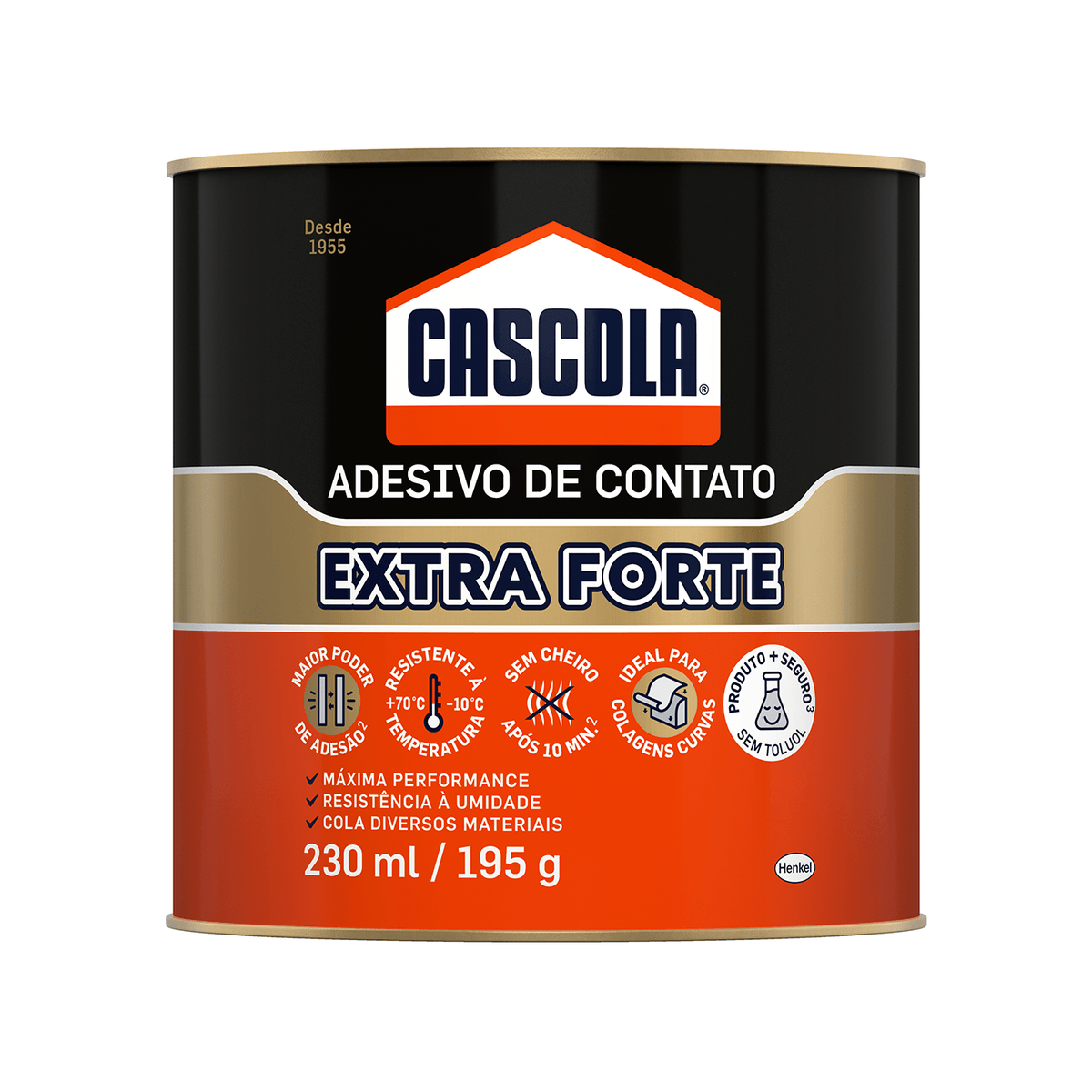 Cola de Contato Cascola Extra Sem Toluol 195g Henkel A Cola de Contato Cascola Extra Sem Toluol 195g Henkel, Devido à sua fórmula sem toluol, Cascola Extra não contém substâncias consideradas inalantes com potencial de abuso que podem desencadear a autoadministração, é mais rápida na secagem e não possui odor após 10 minutos. Ideal para post-forming, couro, folha de metal, MDF, lambris, linóleo, compensado, HDF, fibras, laminados decorativos, metais, entre outros Cola de Contato Cascola Extra Sem Toluol 195g Henkel, é uma cola de contato extraforte para as colagens mais críticas, Não contém toluol - solvente que pode causar dependência química, Extraforte, Secagem Rápida, Resistente à água Tempo de Secagem: 5 a 10 minutos, as faixas podem sofrer alteração devido a quantidade de adesivo aplicado, tipo de superfície, condições distintas de temperatura e umidade relativa.,Cascola Extra sem Toluol quando aplicado em camadas uniformes, apresenta um consumo aproximado entre 270 – 320 g/m2 (superfície dupla) variando de acordo com o tipo de material.,Adesivo de contato à base de Policloropreno e solventes orgânicos. * Não contém substâncias consideradas inalantes com potencial de abuso que podem desencadear a autoadministração,Utilize luvas de proteção adequadas e óculos de segurança.