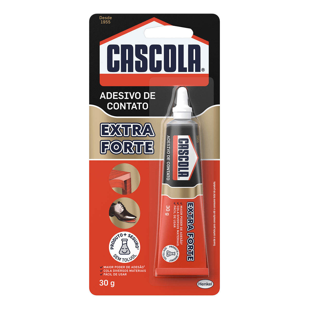 Cola de Contato Cascola Extra Sem Toluol 30g Henkel A Cola de Contato Cascola Extra Sem Toluol 30g Henkel, Devido à sua fórmula sem toluol, Cascola Extra não contém substâncias consideradas inalantes com potencial de abuso que podem desencadear a autoadministração, é mais rápida na secagem e não possui odor após 10 minutos. Ideal para post-forming, couro, folha de metal, MDF, lambris, linóleo, compensado, HDF, fibras, laminados decorativos, metais, entre outros Cola de Contato Cascola Extra Sem Toluol 30g Henkel, é uma cola de contato extraforte para as colagens mais críticas, Não contém toluol - solvente que pode causar dependência química, Extraforte, Secagem Rápida, Resistente à água Tempo de Secagem: 5 a 10 minutos, as faixas podem sofrer alteração devido a quantidade de adesivo aplicado, tipo de superfície, condições distintas de temperatura e umidade relativa.,Cascola Extra sem Toluol quando aplicado em camadas uniformes, apresenta um consumo aproximado entre 270 – 320 g/m2 (superfície dupla) variando de acordo com o tipo de material.,Utilize luvas de proteção adequadas e óculos de segurança.,Adesivo de contato à base de Policloropreno e solventes orgânicos. * Não contém substâncias consideradas inalantes com potencial de abuso que podem desencadear a autoadministração