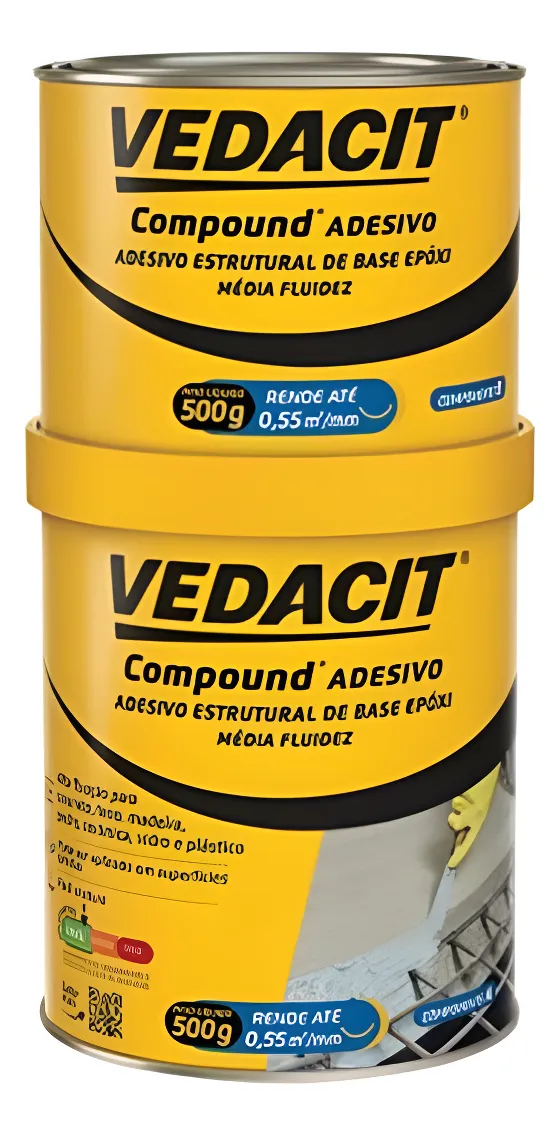 ** Compound Adesivo 1 Kg - Vedacit Otto/baumgard *** Obrigado pela preferência! Será um prazer para nós atendermos vocês! Somos especialistas no Mercado Livre, medalha Platinum em vendas, comprovando nosso total comprometimento em atendê-los da melhor forma possível! Seguem algumas dicas sobre nossas entregas e atendimento. 1º - Nossas entregas são realizadas no mesmo dia para compras realizadas até as 12hrs no ENVIO FLEX e destinadas para coleta do Mercado Envios nas outras compras realizadas até as 13h30, garantindo agilidade na entrega para você! 2º - Nossos estoques estão disponíveis conforme quantidades dos próprios anúncios, sendo todos os produtos A PRONTA ENTREGA! 3º - Prezamos sempre por uma ótima experiência de compra para nosso cliente, por isso, caso não esteja de acordo com o pedido realizado, temos uma equipe para pronto atendimento e resolver todas as questões da melhor maneira possível! Abaixo a descrição do produto desejado. COMPOUND ADESIVO é um adesivo estrutural de base epóxi que apresenta altas resistências em baixas idades, média fluidez, possibilitando grande facilidade para manuseio. Proporciona alto rendimento e excelente aderência a vários tipos de substratos, sendo indicado para colagem, mesmo entre si, de concreto, ferro, madeira, pedra etc. Oferece ótima resistência a água, óleo, graxa e meio agressivo. Pode ser aplicado em superfícies úmidas, embora não encharcadas. COMPOUND ADESIVO apresenta resistência inicial em 24 horas e resistência máxima final 7 dias depois da aplicação. CARACTERÍSTICAS DO COMPONENTE A Densidade: + B : 1,80 g/cm³ Aparência: Branco(a) Composição básica: Resina epóxi. CARACTERÍSTICAS DO COMPONENTE B Densidade: g/cm³ Aparência: Preto(a) Composição básica: Poliamina. Validade: 12 meses CAMPOS DE APLICAÇÃO colagem de concreto, ferro, madeira, azulejo, cerâmica, pedra, fibrocimento, vidro e plásticos reparos em concreto ancoragens chumbamentos. Informações Técnicas: Preparo do substrato As superfícies a serem coladas ou reparadas devem estar limpas, porosas, isentas de pó, oleosidade e partículas soltas. Para aplicação em vidros e plásticos, a superfície deve ser previamente lixada. No caso de ancoragens e chumbamentos, executar os furos de acordo com o projeto. Em seguida, fazer a limpeza com jato de ar ou água, eliminando qualquer partícula solta. Geralmente o diâmetro do furo deve ser 1 diâmetro-padrão acima do diâmetro da barra. Exemplo: uma barra de aço CA-50 de 8 mm a ser ancorada deve ter um furo de 10 mm. Preparo do produto Executar uma pré-mistura dos componentes A e B separadamente, em suas respectivas embalagens. Adicionar então o componente B na embalagem do componente A e misturar perfeitamente os 2 componentes, utilizando uma espátula ou misturador mecânico, até a obtenção de uma massa homogênea de cor cinza e sem grumos. Utilizar o produto em, no máximo, 50 minutos, à temperatura de 25 °C, depois de realizada a mistura. Caso não seja utilizado todo o conjunto de uma só vez, misturar os componentes na proporção 1:1 (componente A:componente B), em peso. Aplicação COMPOUND ADESIVO é aplicado como pintura, com pincel, trincha ou espátula, preenchendo todas as superfícies a serem coladas ou reparadas, respeitando o consumo. Os materiais que serão colados ou reparados devem ser colocados em contato o mais rápido possível, respeitando o prazo máximo de até 50 minutos após a mistura do COMPOUND ADESIVO. Para as ancoragens e chumbamentos o COMPOUND ADESIVO deve ser vertido no furo em sua totalidade. As peças as serem ancoradas ou chumbadas devem ser colocadas sob pressão e com leves movimentos de rotação, até atingir a profundidade determinada em projeto. Deixar as peças de ancoragens ou chumbamentos imóveis, até a secagem completa do produto que pode variar de acordo com a temperatura ambiente. Consumo aproximado Colagens e reparos: mínimo 1,8 kg/m²/mm Ancoragens e chumbamentos: varia conforme diâmetros do furo, diâmetro da barra e profundidade de ancoragem, vide fórmulas e tabela. Fórmula 1 - VF = (Df - Db) x L Fórmula 2 - Cp = VF x Dp VF - Volume do furo (cm³) Df - Diâmetro do furo (cm) Db - Diâmetro da barra (cm) L - Profundidade de ancoragem (nota: geralmente, considera-se 10 vezes o diâmetro da barra) (cm) Cp - Consumo aproximado (g) DP - Densidade do produto (g/cm³) Rendimento Lata de 1 kg (A+B) - 0,55 m²/mm