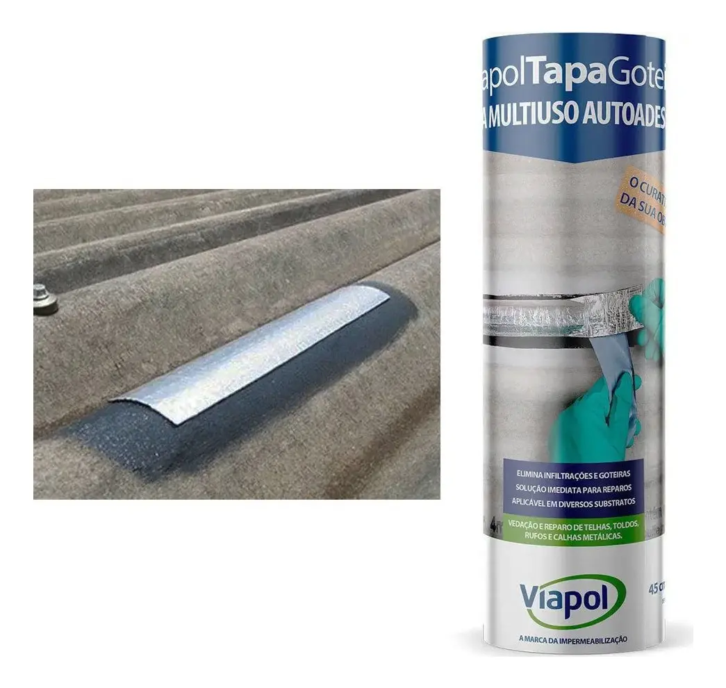 Fita Viapol Tapa Goteira é uma fita multiuso autoadesiva flexível fabricada a base de asfalto modificado com adição de polímeros. Possui acabamento de filme de alumínio, assegurando durabilidade ao produto, reflexão dos raios solares e impermeabilidade.