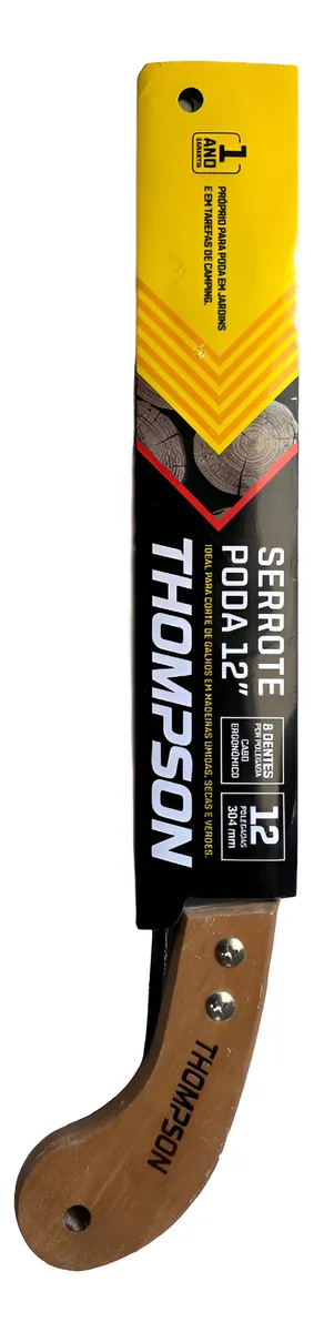 SERROTE PODA THOMPSON 12 POLEGADAS ========================================= - Marca: Thompson. - Ideal para corte de galhos em madeiras úmidas, secas e verdes. - Com corte em duplo sentido, é de fácil manuseio e muito eficiente. - Lâminas produzidas com aço temperado SAE 1070, dentes travados, 8 dentes por polegada com protetor plástico. - Cabo de madeira envernizado com 2 parafusos. - 12 Polegadas. - Cabo Ergonômico.